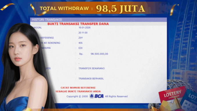 DEWATOGEL mengucapkan selamat kepada user id : EDI*** yang telah berhasil mendapatkan jackpot pada permainan TOGEL DI JAKARTA 5D. Kemenangan sebesar Rp 98.500.000,-. telah dibayarkan LUNAS oleh pihak dewatogel kepada pemilik user id setelah yang bersangkutan mengisi formulir withdraw. Proses pencairan dana berlangsung sangat cepat hanya dalam waktu 5-10 menit sudah berada dalam rekening pemilik user id. Bukti transfer yang dapat anda lihat adalah bukti SAH / VALID yang langsung di dapatkan melalui bukti transaksi dari Bank yang digunakan untuk pengiriman dana pada rekening pemilik user id. Terima kasih kami sampaikan kepada para pengguna setia DEWATOGEL yang telah menggunakan situs kami, sebagai Bandar Terpercaya yang pastinya membayar semua kemenangan member hingga lunas. Apakah DEWATOGEL PENIPU ? Reputasi “DEWATOGEL TERPERCAYA” sudah sangat melekat. puluhan hingga ratusan ribu pengguna setia DEWATOGEL tetap menggunakan situs terbesar dan terbaik di Indonesia ini. Hapus rasa was-was dan khawatir anda, kemenangan anda berapapun PASTI dibayarkan hingga lunas.